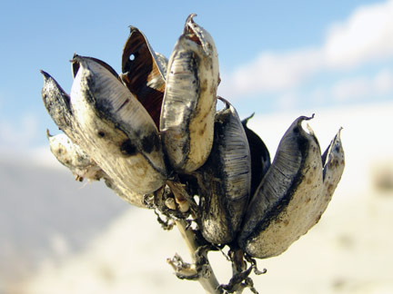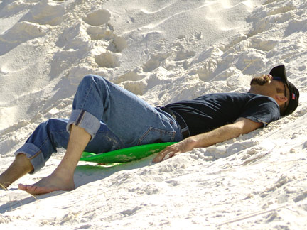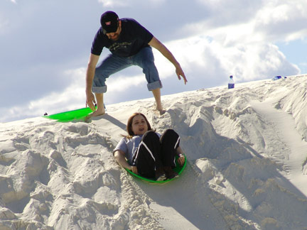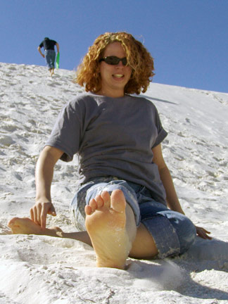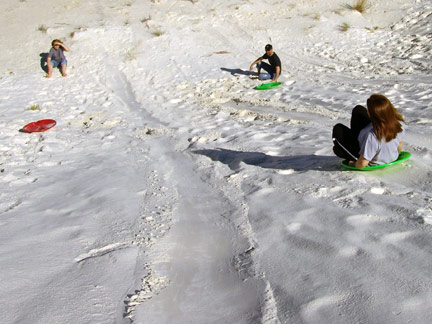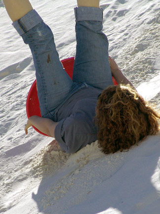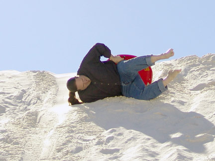 tuesday we went out to white sands, where we slid down the sand dunes on some plastic snow discs. the temperature was probably in the low 60s (quite a difference from the 110+ degrees when doc and i visited in june). we slid down the hills a bunch of times, tumbled head over heels a lot, got sand in our craw, laid out in the sunshine on the brilliant white sands, and enjoyed the complete and utter silence, save for the sound of the stealth fighters taking off from the nearby white sands missile range.