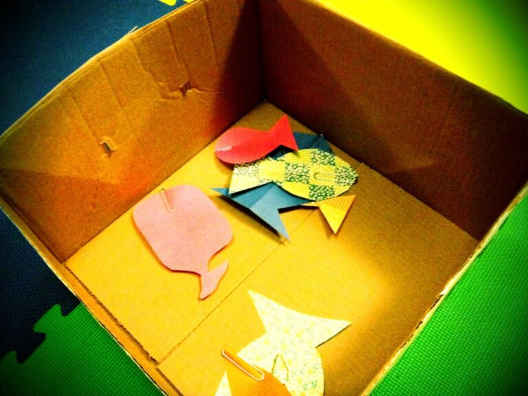 We cut out and decorated some fish from origami paper, attached a paper clip to each one, and then went…