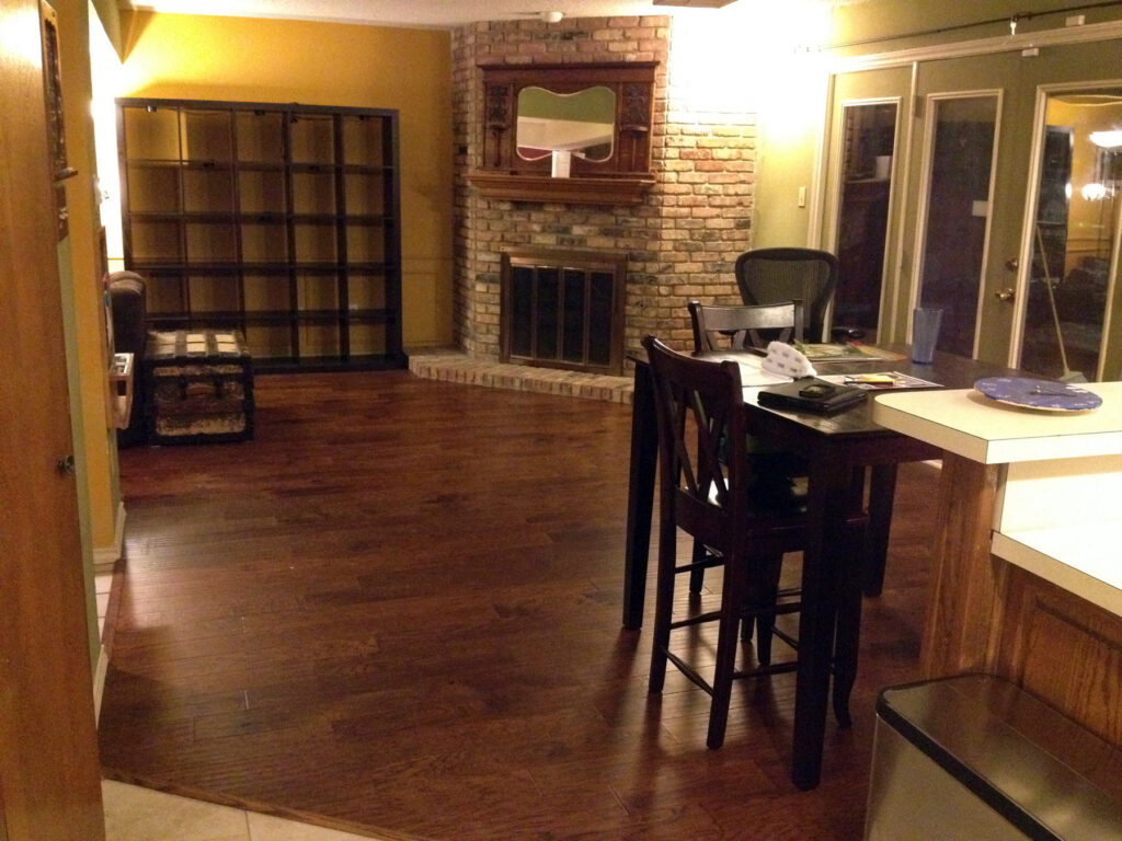 The next day he came back out with wood samples. We fell in love with the wide-plank handscraped hickory in a color called “copper” (which is really a nice medium brown) and decided to tighten our belts and spend the extra money.