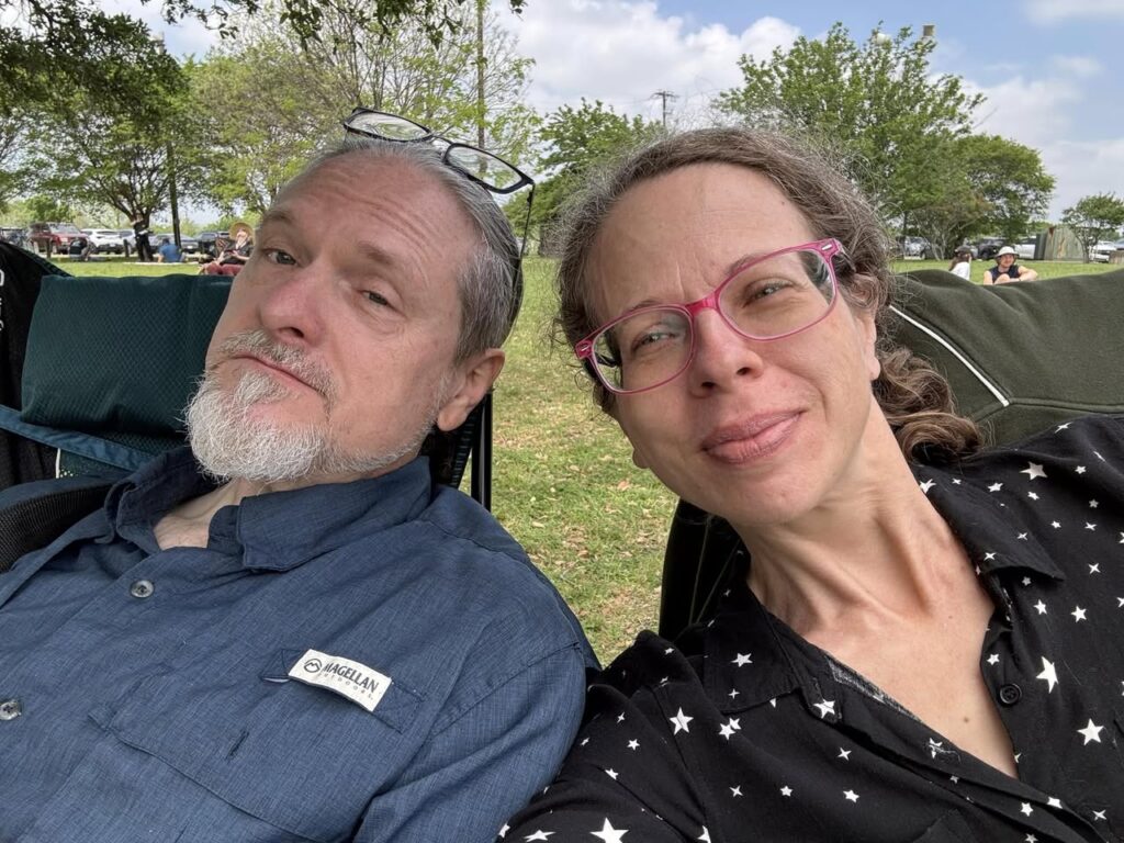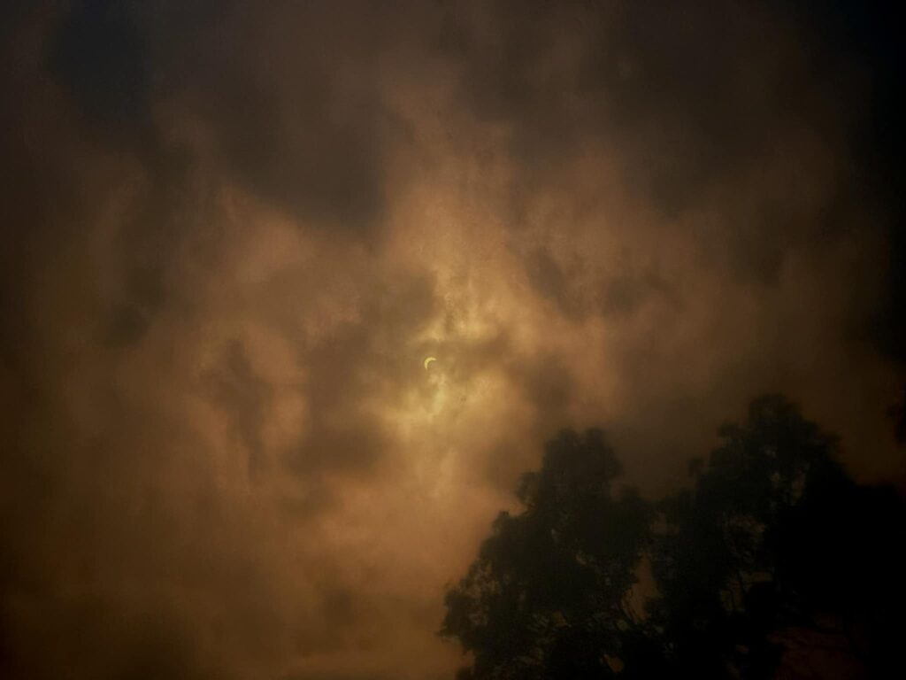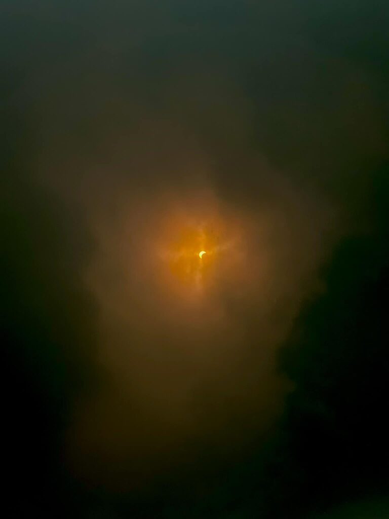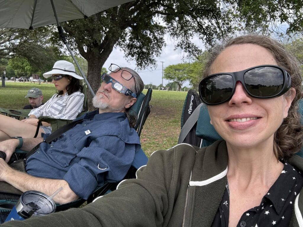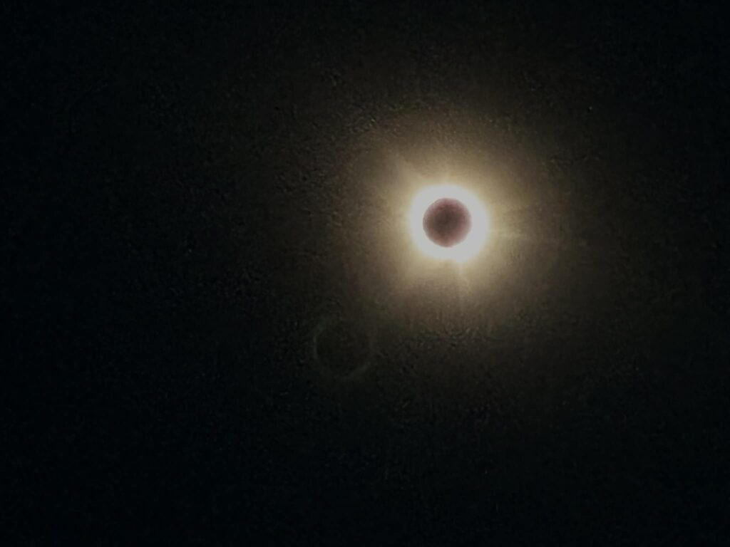 Here are videos of the descent into totality (where you can see shadow bands rippling across the grass, especially if you scrub through the video at a higher speed) as well as the “diamond ring” effect that lasted for a second or two when totality ended.