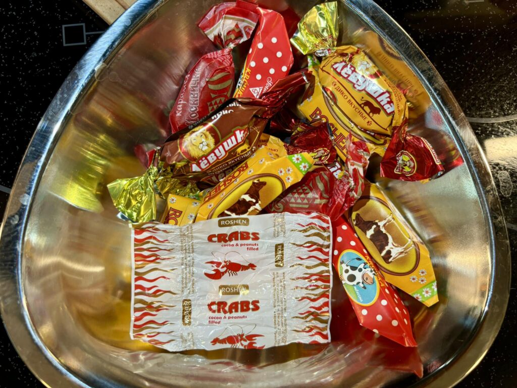 Here is a selection of Russian candy that we bought from the Euro Deli. Doc pointed out that the picture on the Crabs Candy is actually a lobster. The moo cow caramels are actually quite good. Most of the candy tastes very sweet and sort of one-dimensional to me — not something I’d necessarily seek out. My sister-in-law, who grew up in Russia and Ukraine, said that things like fruit and candy were very special and rare treats in her childhood and all of this feels very nostalgic to her.