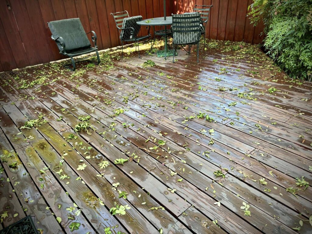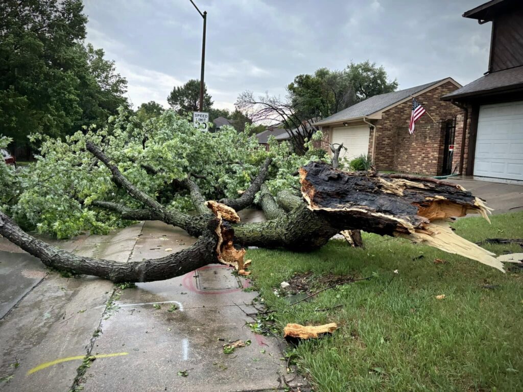 No damage to our property, but our neighbor’s tree came down. Many many trees and branches down all over town; electrical wires and poles too (thus our lack of power).