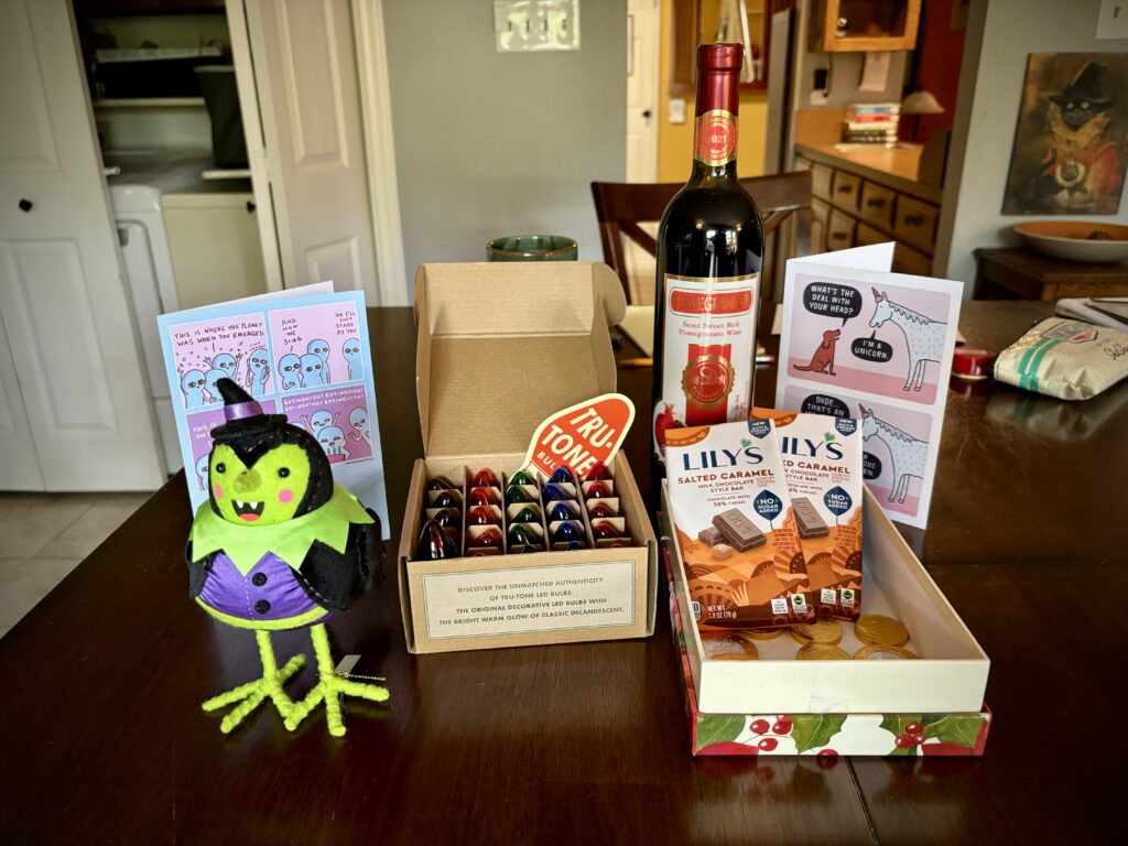 And I even got presents! It’s not every day that someone gives you a present! Doc and Jamie got me caramel, wine, a freaking adorable Halloween bird, and some Tru-Tone vintage style Christmas light bulbs. I also went to IKEA for a mini greenhouse for my new succulents!