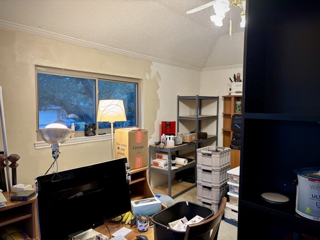 As if packing up our belongings and dismantling all furniture from the entire 2nd floor of our house (which includes both bedrooms, all storage closets, and our enormous combined art/music/photo studio and office space), and slicing up the existing carpet to screw down squeaky floorboards to the beams wasn’t enough, SOMEONE (and I’m not saying who okay it was me) decided that we also must paint the walls in the studio room before the new carpet gets installed next week.