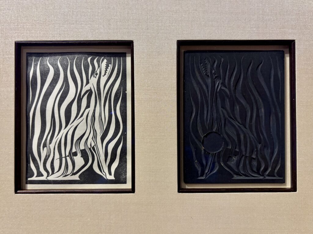 I really liked seeing a couple examples of his actual woodcut blocks, which all had large circles cut into them, effectively destroying the original piece so it could no longer be reproduced.