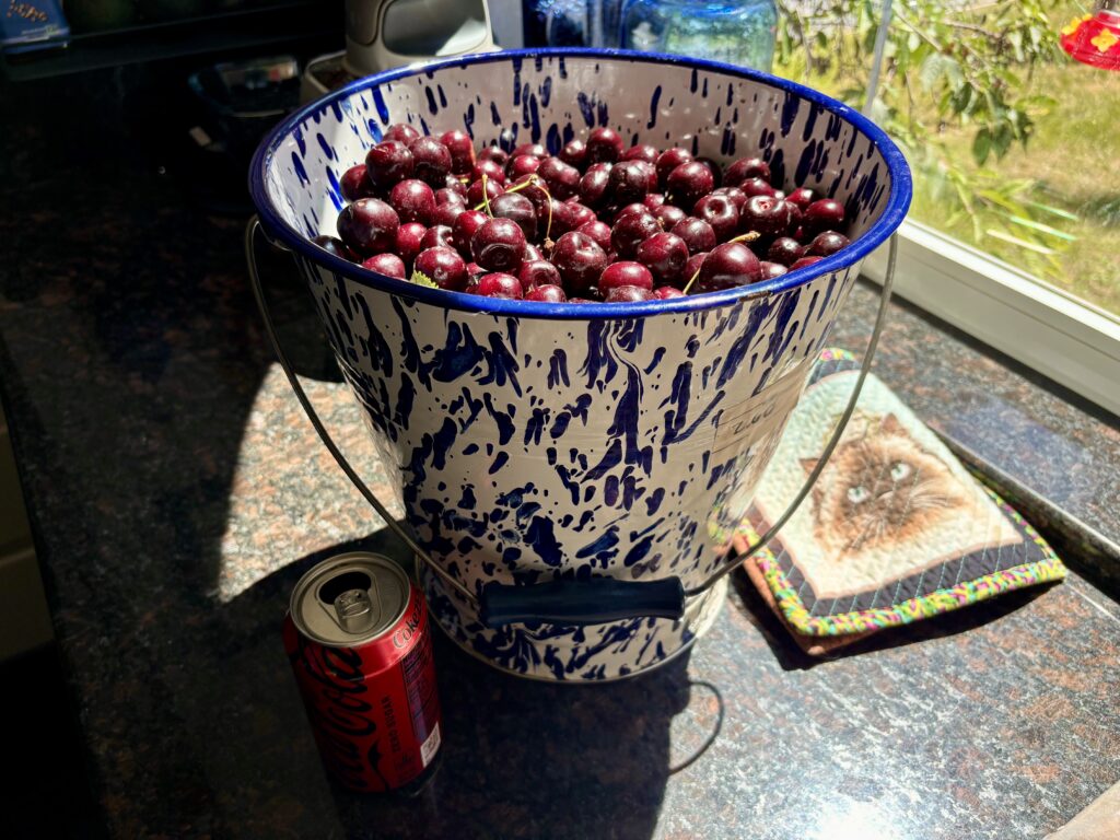 My parents’ cherry tree was absolutely laden with perfectly ripe cherries. Cherries are one of my very favorite fruits, and I could hardly pass up this opportunity to collect free food from nature (do you know how expensive cherries are in Texas? It’s crazy!). So I climbed the tree to get at the cherries that were out of arms’ reach. I’m 52 years old and shimmied up a tree. I did not fall. My rock climbing skills are paying off!