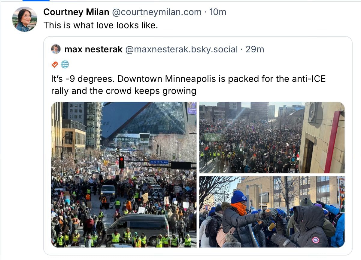 They have made a massive gamble, and I believe they are losing that gamble. One part of it is as I have written before about the nature of power itself: that they have most or all of it, because they do not understand the powers of civil society and the power of nonviolent resistance and noncooperation. Another part is about human nature; they seem to assume that most of us are selfish and timid and will not resist once we see their capacity to dominate and do violence, that we do not care about anything much beyond our individual selves, or that we will see them as winners and admire winning so much we’ll come on over. Like Sauron they suffer from failure of imagination. The thing they cannot imagine is us.