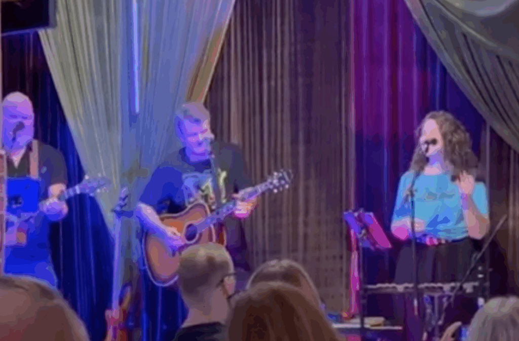 Kathryn’s new band, Myld Stallyns, played at Opening Bell Coffee last night, and she totally KILLED IT on Peter Murphy, as I knew she would.