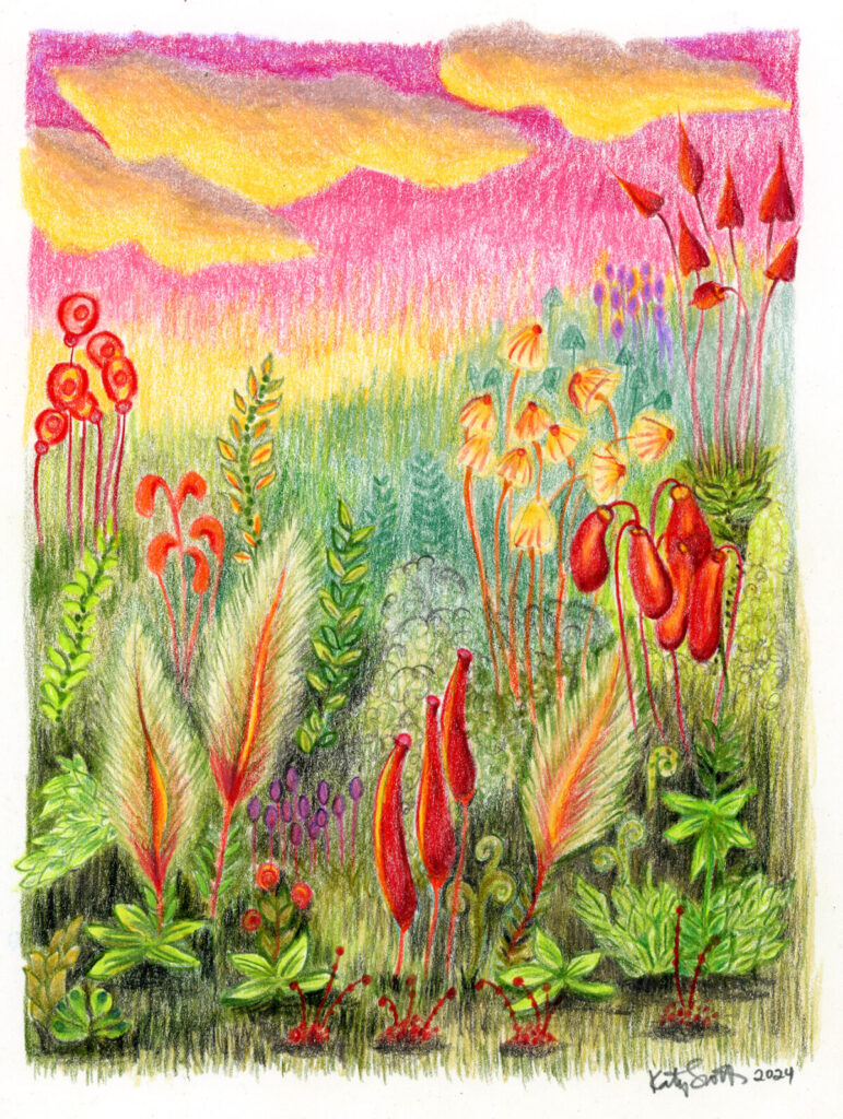 Title: Bryophyte Orchard 2Medium: Prismacolor on paperSize: 6″ x 8″Date: 2024Price per print: $75Available for purchase at katyscott.com.