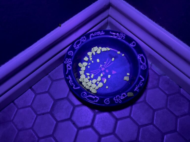 Is this dish of cat food glowing under blacklight? My bionic eyeballs say no, but apparently that is absolutely not reality.